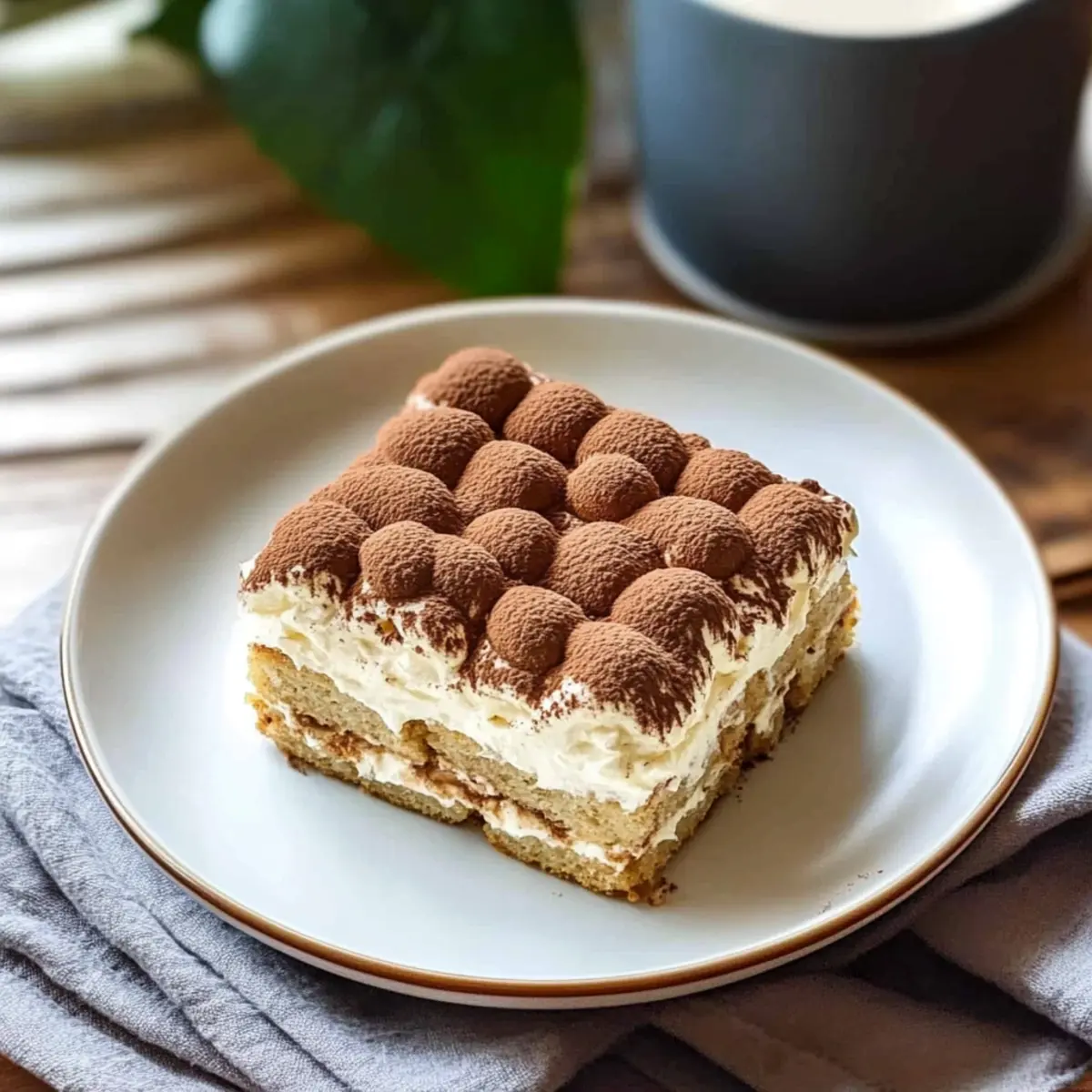 Just before serving, sift cocoa powder generously over the top of your chilled tiramisu for a touch of elegance and flavor. Use a fine-mesh sieve to achieve a beautiful, even dusting, and then slice into squares to serve your delightful 10-Minute Easy Tiramisu.