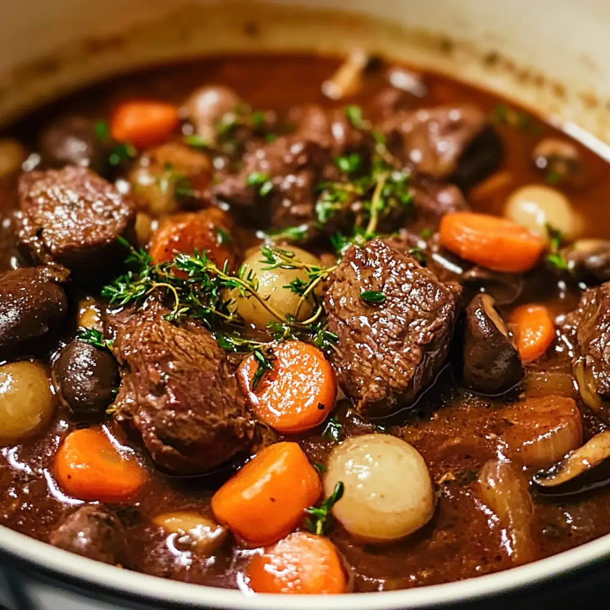 Once the beef has cooked to fork-tender perfection, gently fold in your sautéed pearl onions and mushrooms. Let the mixture sit for about 10 minutes before serving; this resting period allows the flavors to meld beautifully. Serve your delicious Beef Bourguignon warm and enjoy the cozy, comforting meal!