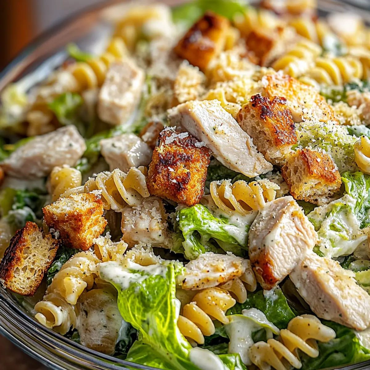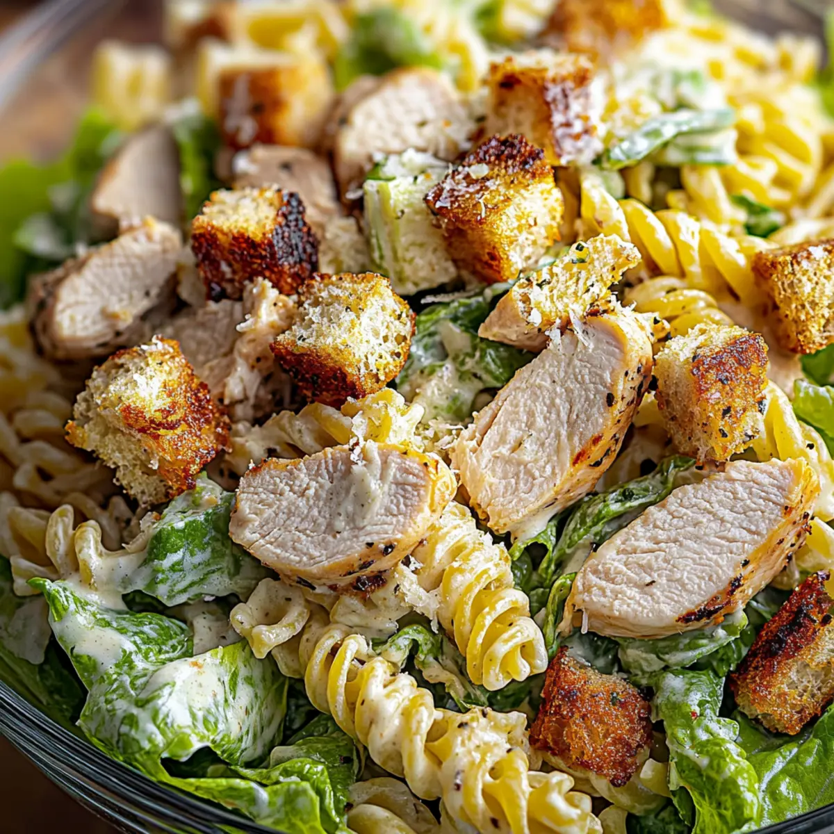- Combine the Ingredients: In a bowl, add chopped romaine, cooled pasta, sliced chicken, croutons, and Parmesan. Toss with dressing.