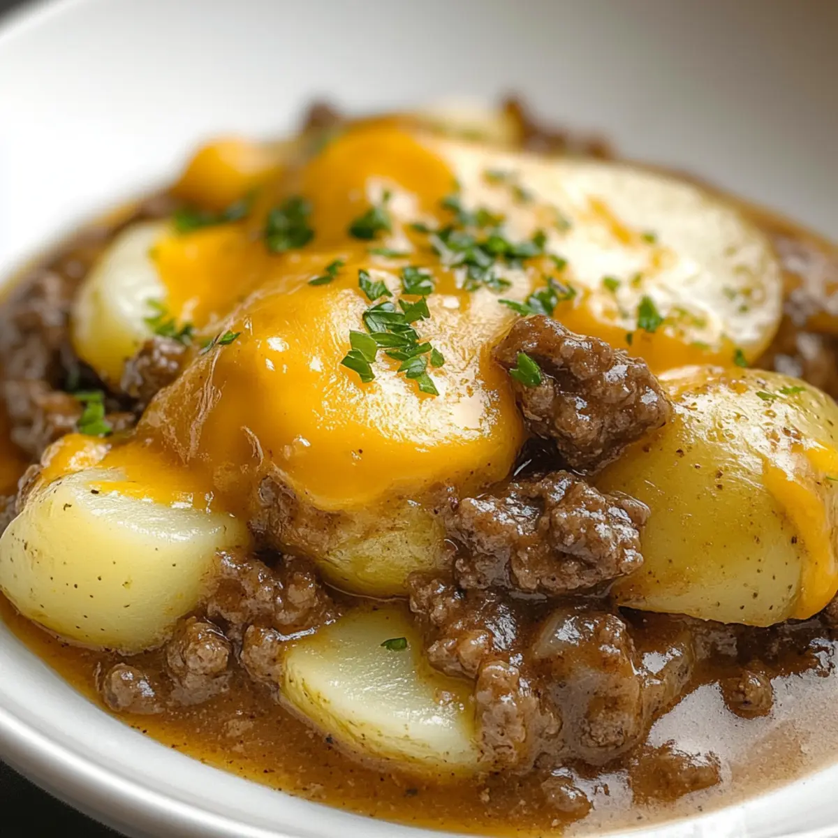 - Step 3: Layer Ingredients: In a greased crockpot, layer half of the sliced potatoes, then half the cooked beef mixture, and sprinkle 1 cup of cheddar cheese. Repeat the layers.