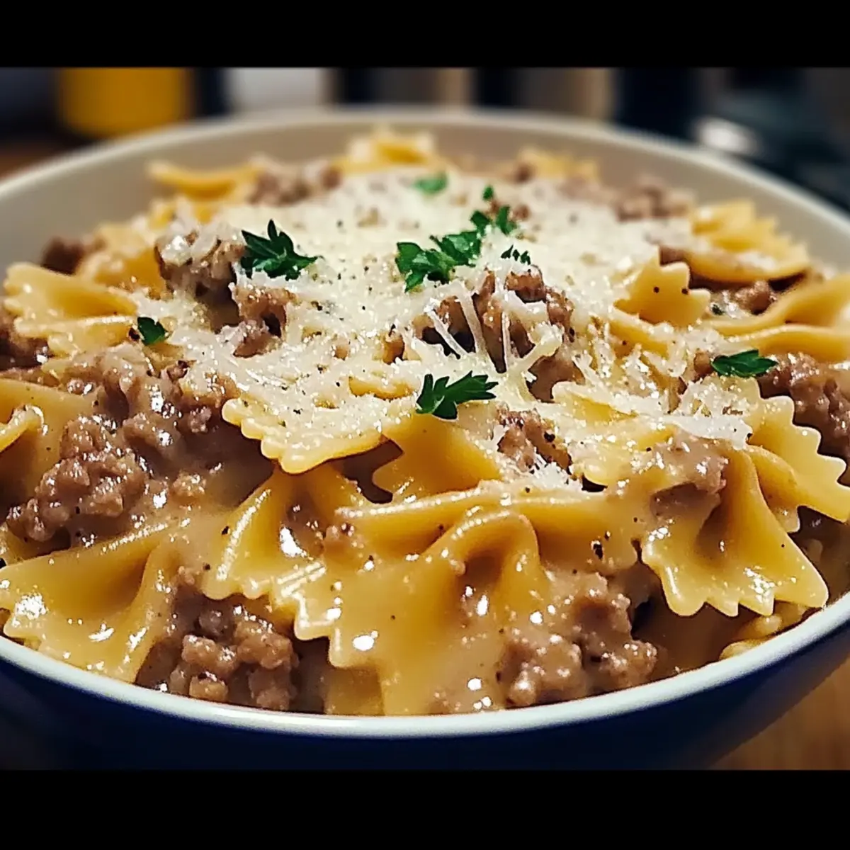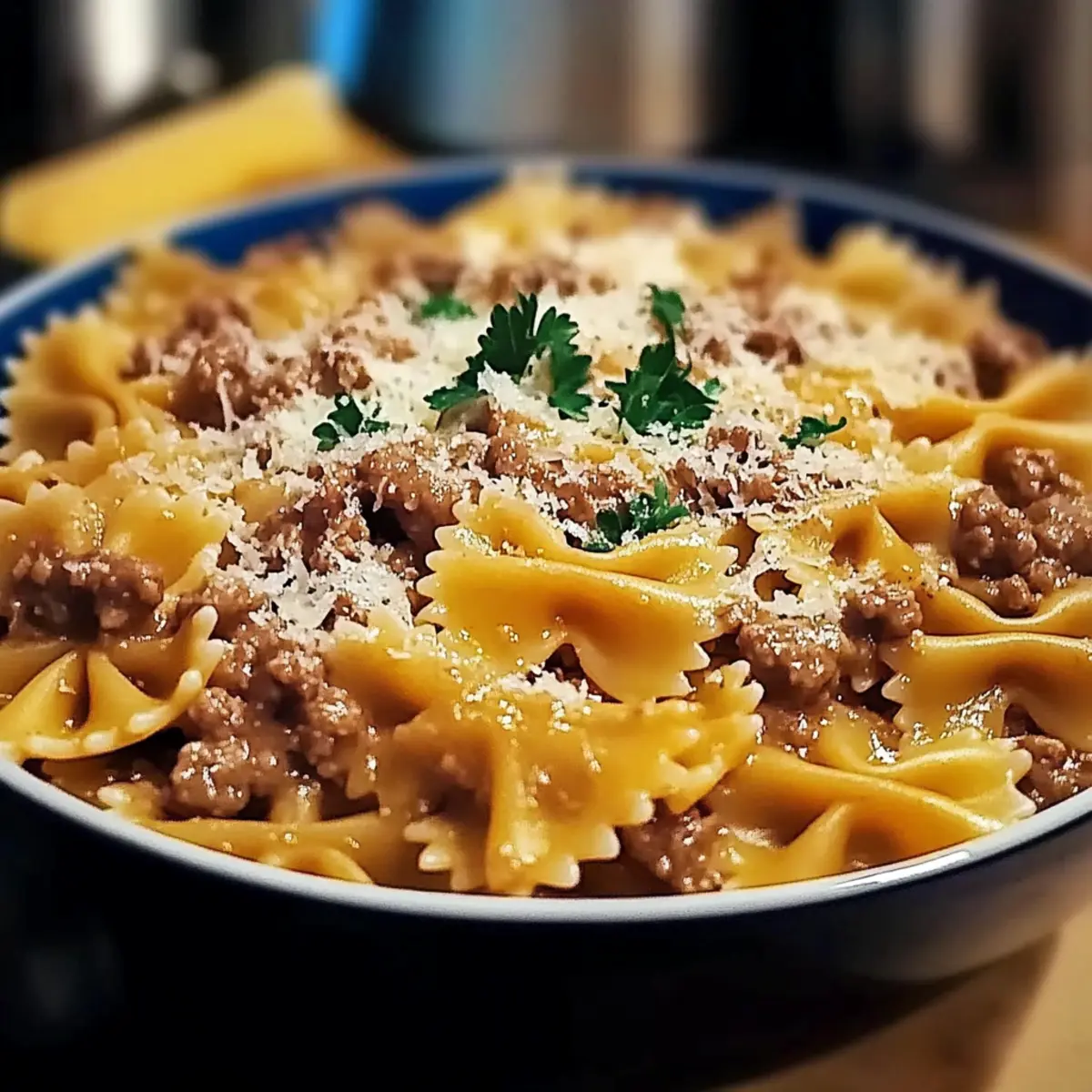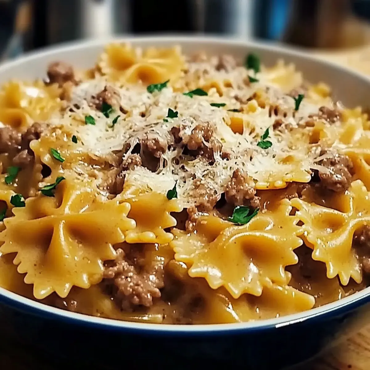 - Combine the drained bowtie pasta with the creamy beef sauce, tossing gently. Garnish with fresh parsley and serve immediately.