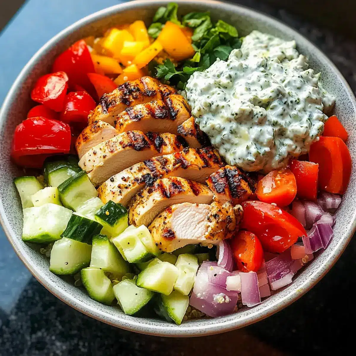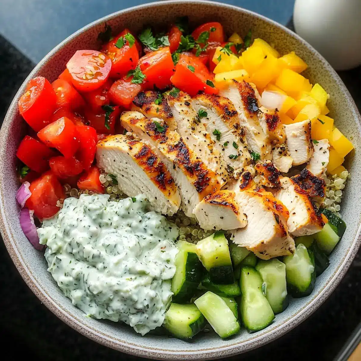 - Assemble the bowls by starting with the rice or quinoa base, layering with fresh vegetables, chicken, and topping with tzatziki and a drizzle of olive oil.