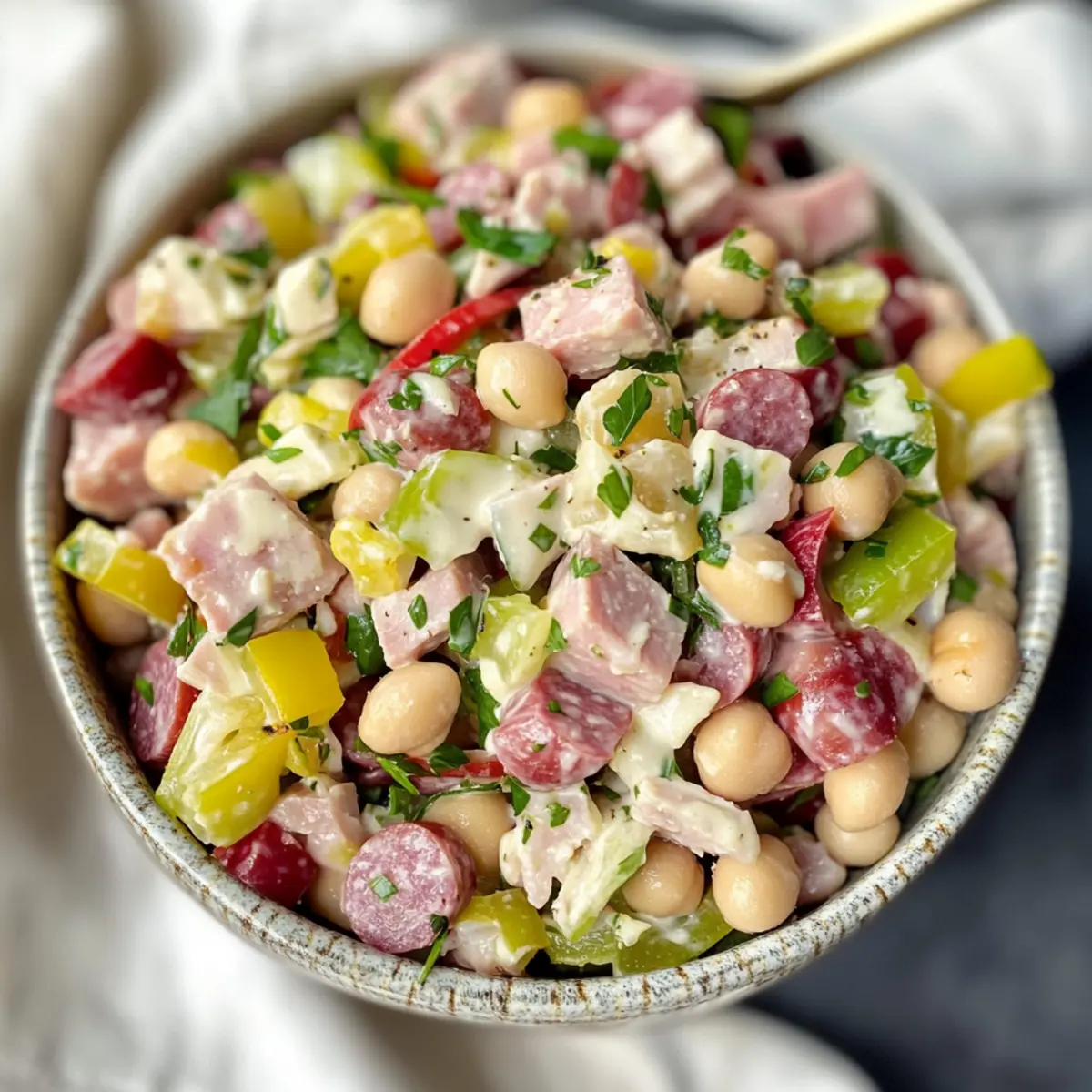 - Diced Salami – Offers rich flavors and traditional deli taste. Swap for another cured meat or omit entirely for a lighter salad.