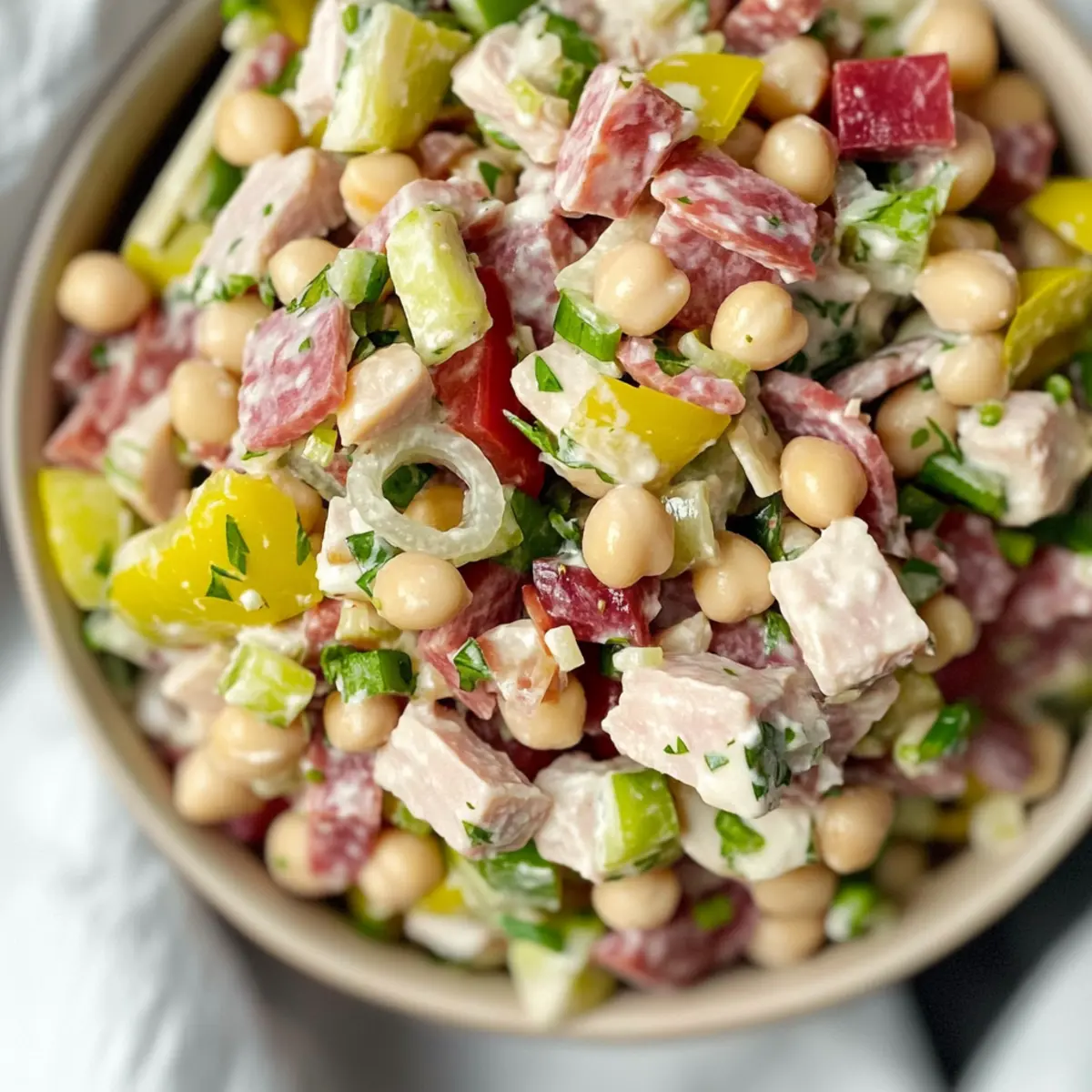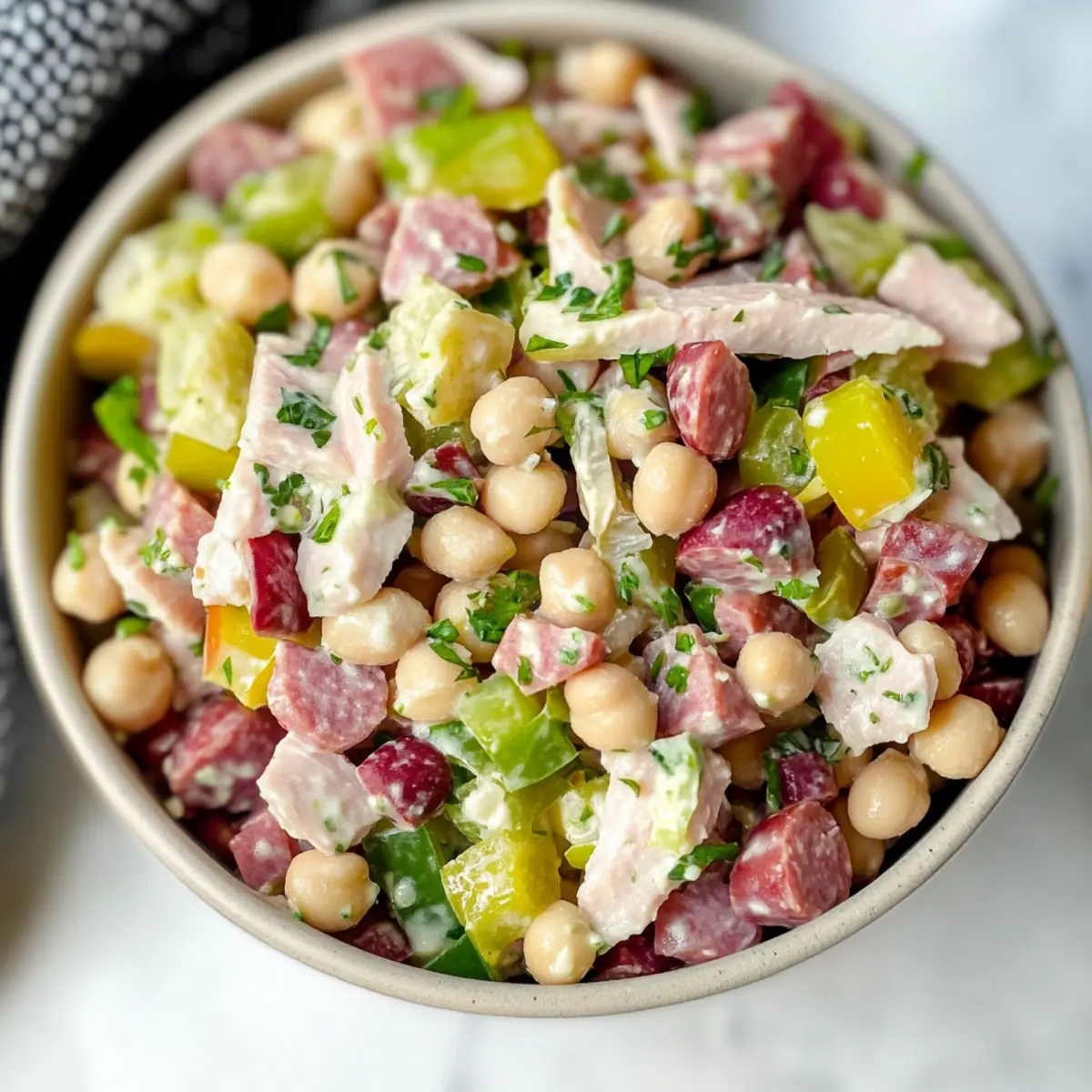 Absolutely! This salad is versatile and can easily accommodate various dietary needs. For a vegetarian version, simply omit the turkey and salami or replace them with marinated artichokes. If you’re looking for gluten-free options, just be sure to choose gluten-free meat alternatives and check your condiments. Always be mindful of any allergies—using dairy-free yogurt and cheese substitutes is easy to make this salad suitable for a vegan diet!