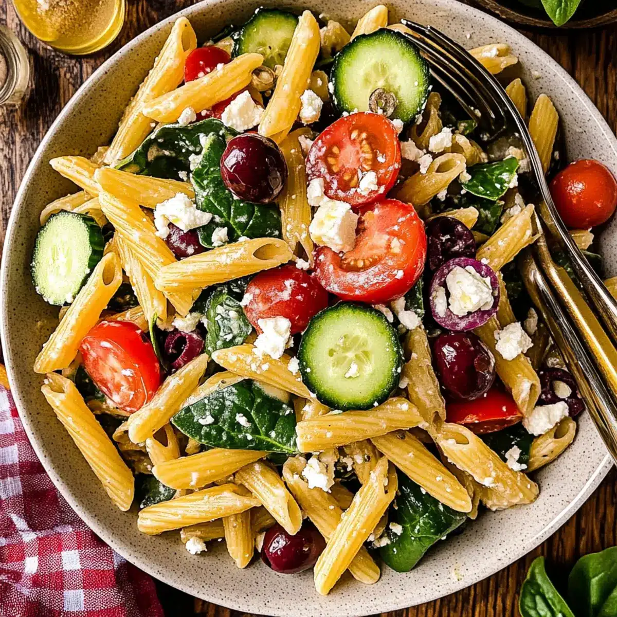 In a spacious mixing bowl, combine the halved grape tomatoes, sliced cucumbers, diced red onion, and baby spinach. Stir the vegetables gently to mix, allowing their vibrant colors to blend beautifully. This Mediterranean Pasta Salad will shine with these fresh ingredients, so make sure everything is evenly distributed for maximum flavor in each bite.