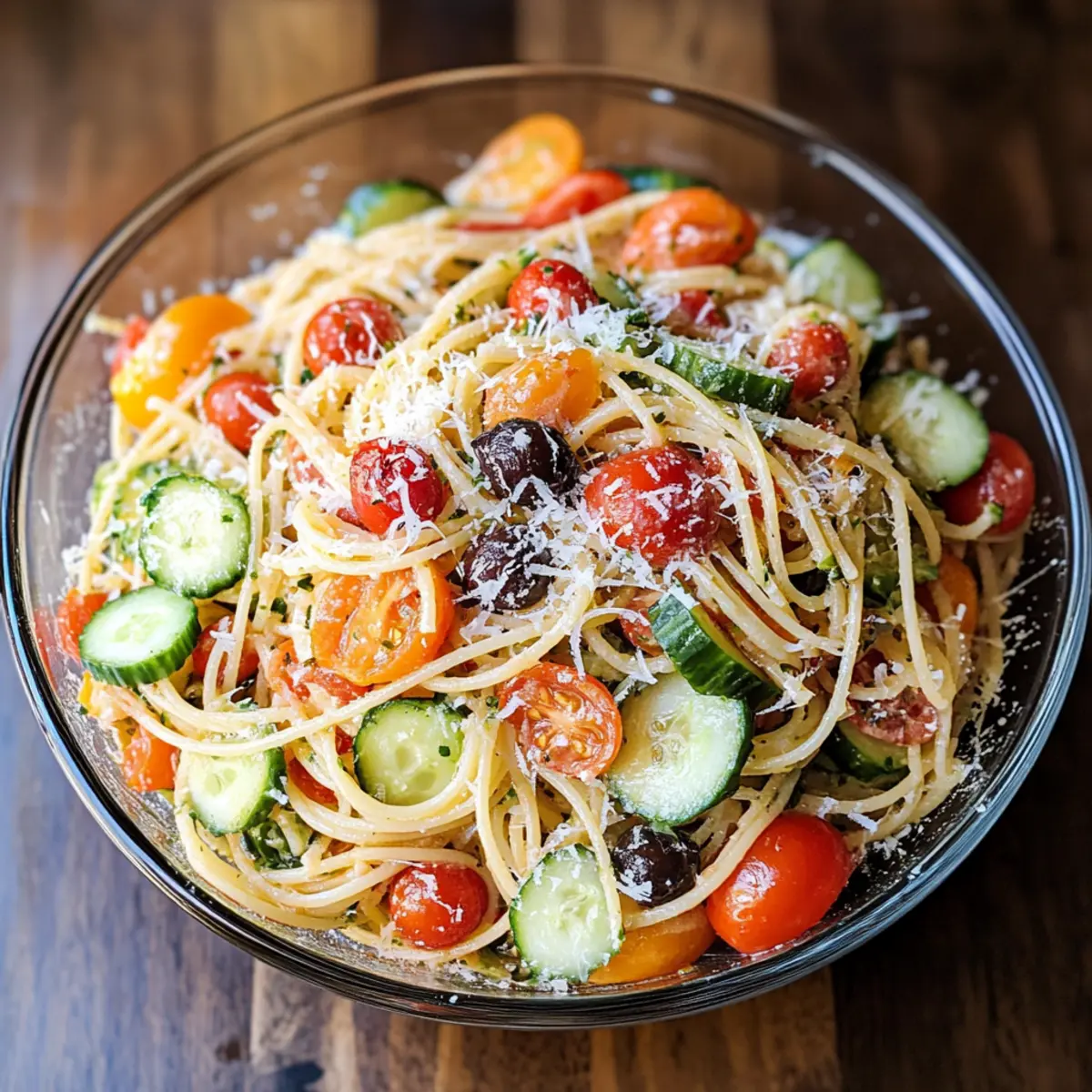 This Spaghetti Salad is a fantastic option for meal prep, allowing you to enjoy a delicious dish without last-minute hassle! You can prepare the spaghetti and chop your vegetables up to 24 hours in advance. Simply cook the spaghetti, rinse it under cold water, and store it in an airtight container. Likewise, chop the cherry tomatoes, bell pepper, cucumber, and onion and keep them refrigerated to maintain freshness. When you’re ready to serve, combine the pasta with the dressing and other ingredients, then chill for an additional hour if possible for the best flavor. With these make-ahead tips, you’ll have a delightful, vibrant salad without the stress—perfect for busy weeknights or gatherings!