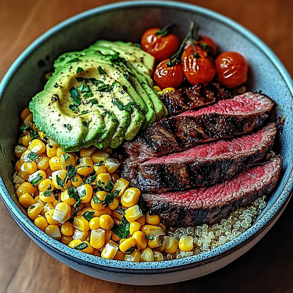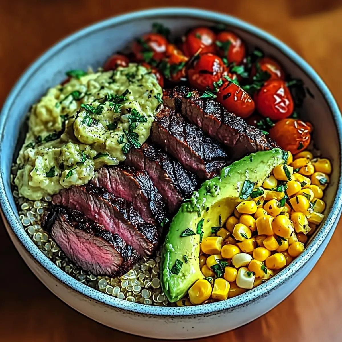 - Assemble the Bowl: Layer cooked quinoa or brown rice, steak, corn, tomatoes, onion, and avocado.