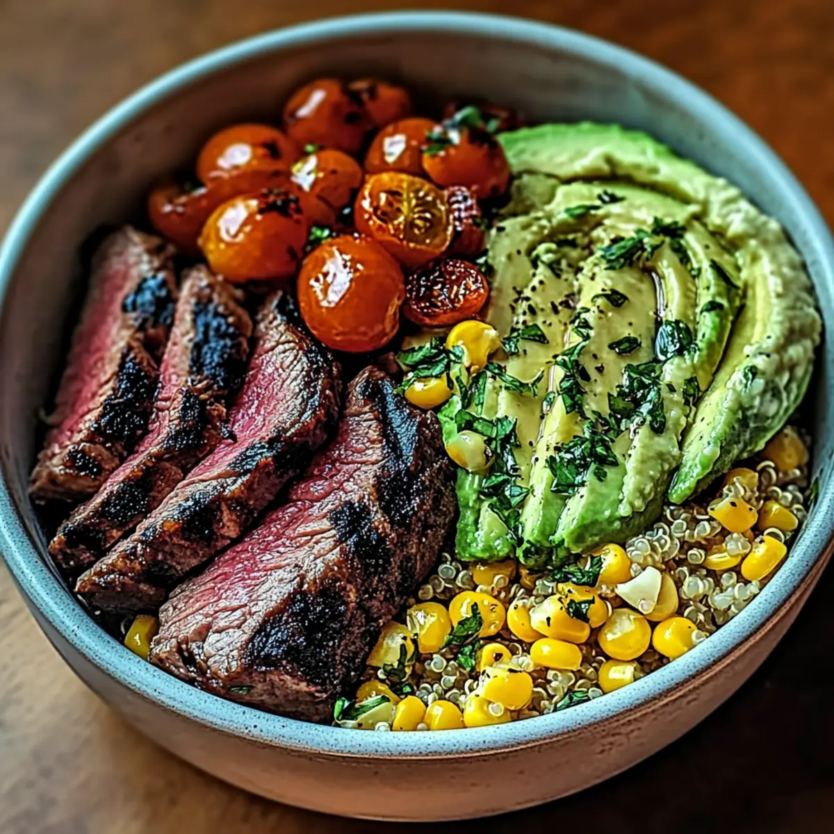 Begin assembling your Steak Avocado Corn Bowl by adding a generous scoop of cooked quinoa or brown rice as the base. Layer the sliced steak, grilled corn, halved tomatoes, diced onion, and avocado on top. Squeeze a bit of lime juice over the entire dish and sprinkle with fresh cilantro for an aromatic finish.