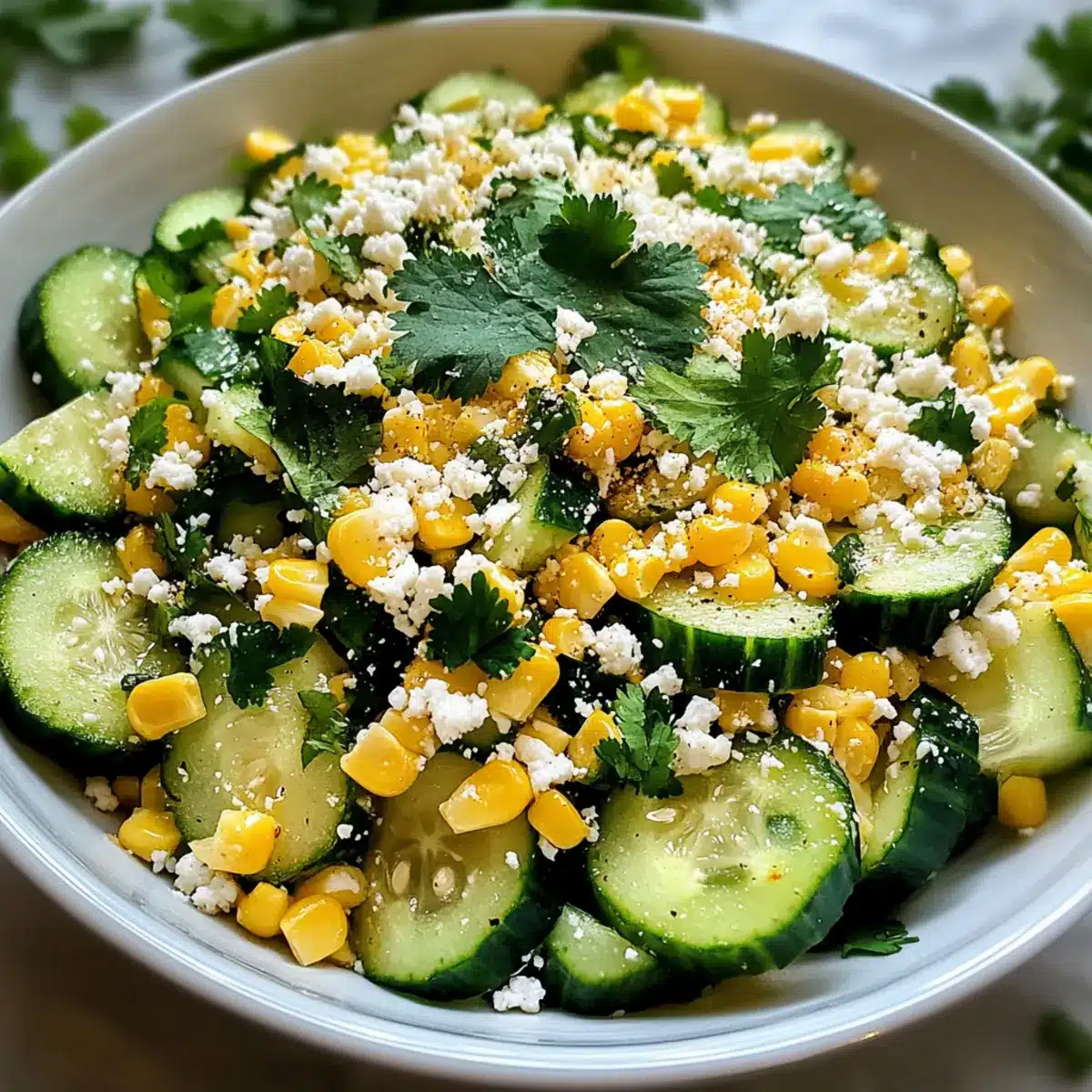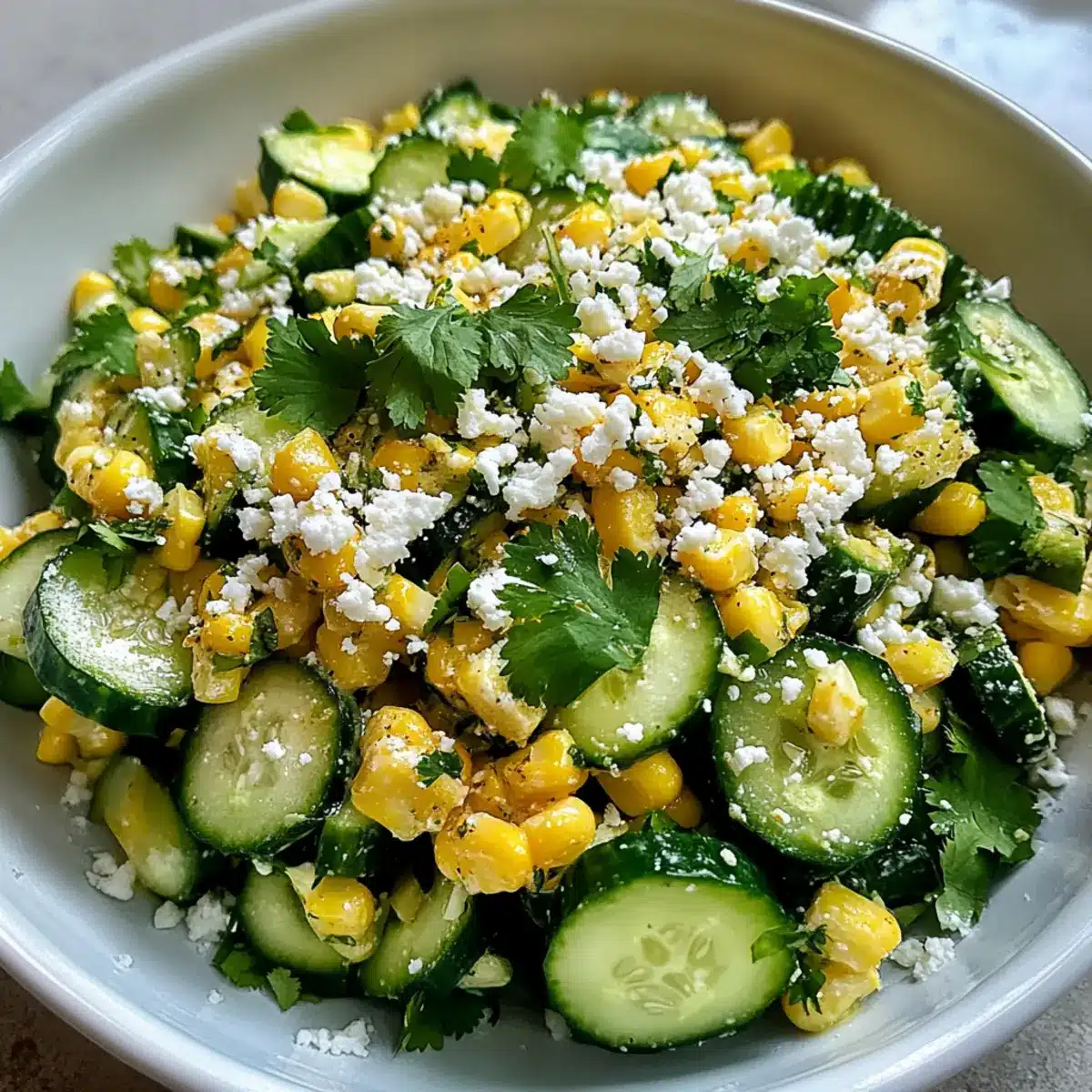 - Sprinkle crumbled cotija cheese and chopped cilantro over the cucumber and corn mixture.
