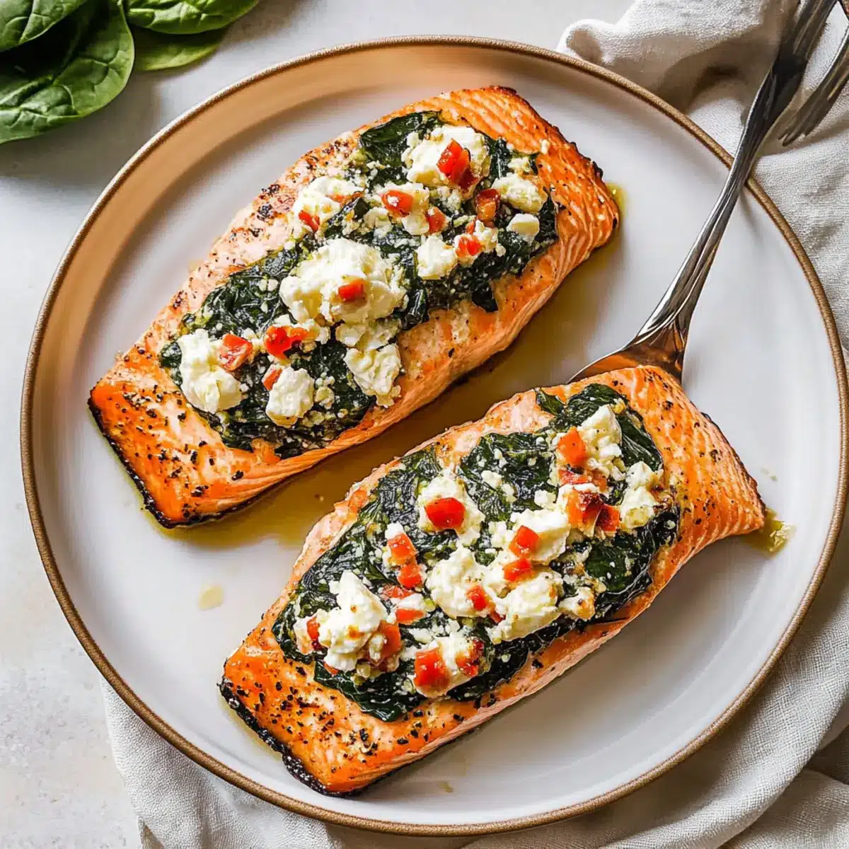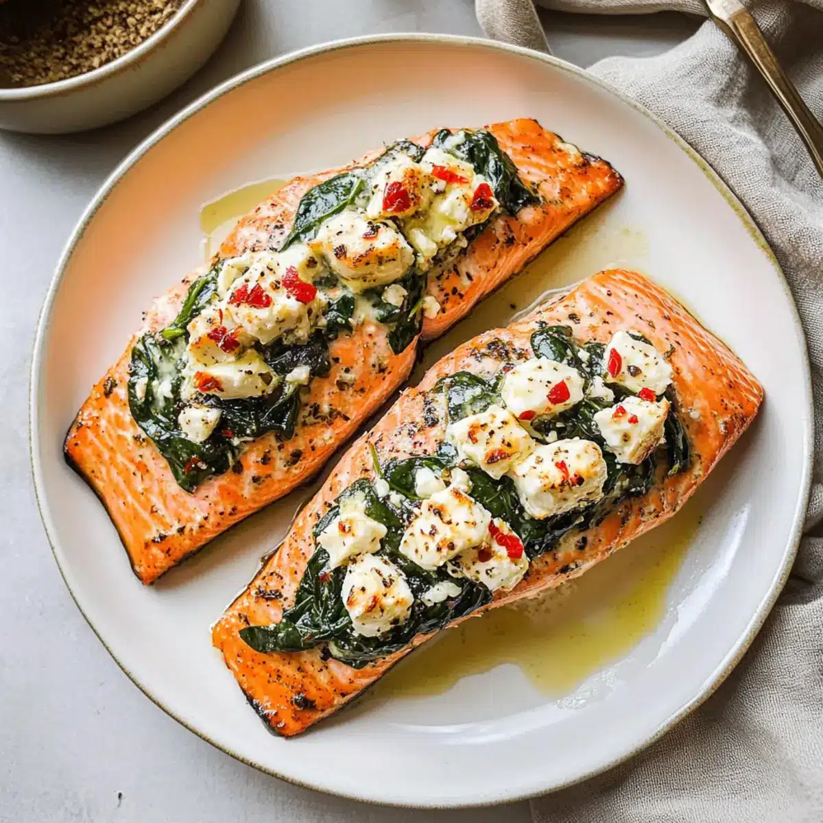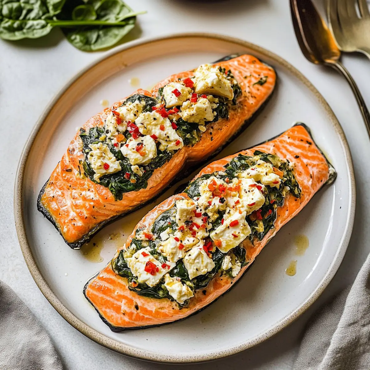 Creamy Spinach: Add cream cheese to the spinach mixture for a richer stuffing. The extra creaminess offers a delightful contrast to the flaky salmon.