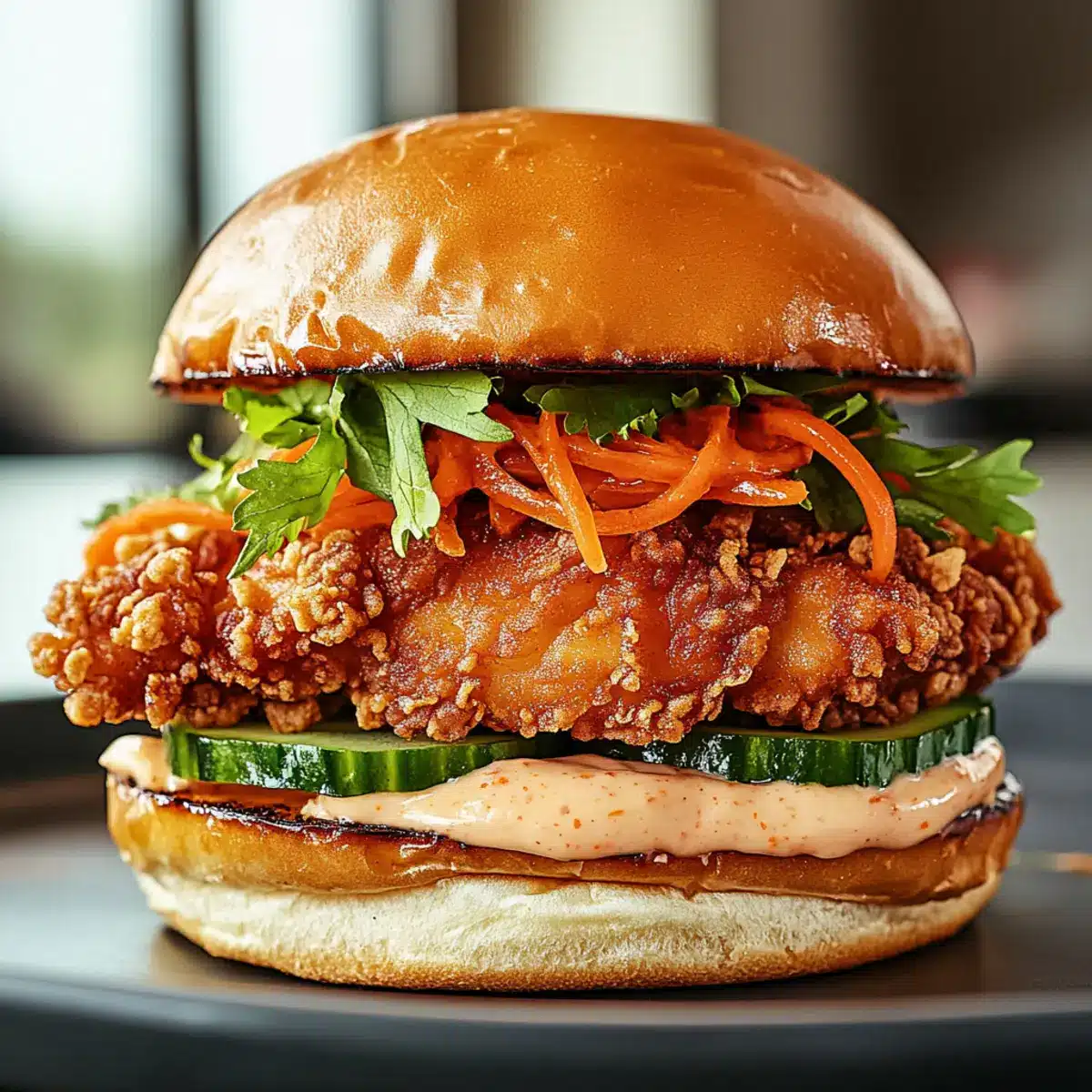 - Assemble sandwiches with buns, chili mayo, fried chicken, cucumbers, pickled carrots, and herbs. Top with the other half of the bun.