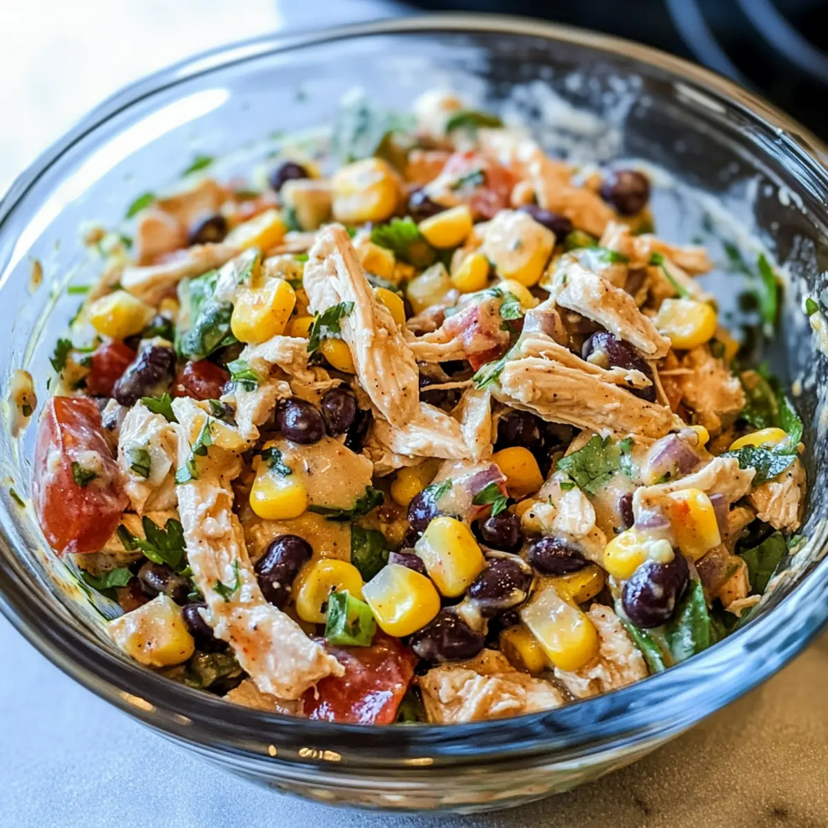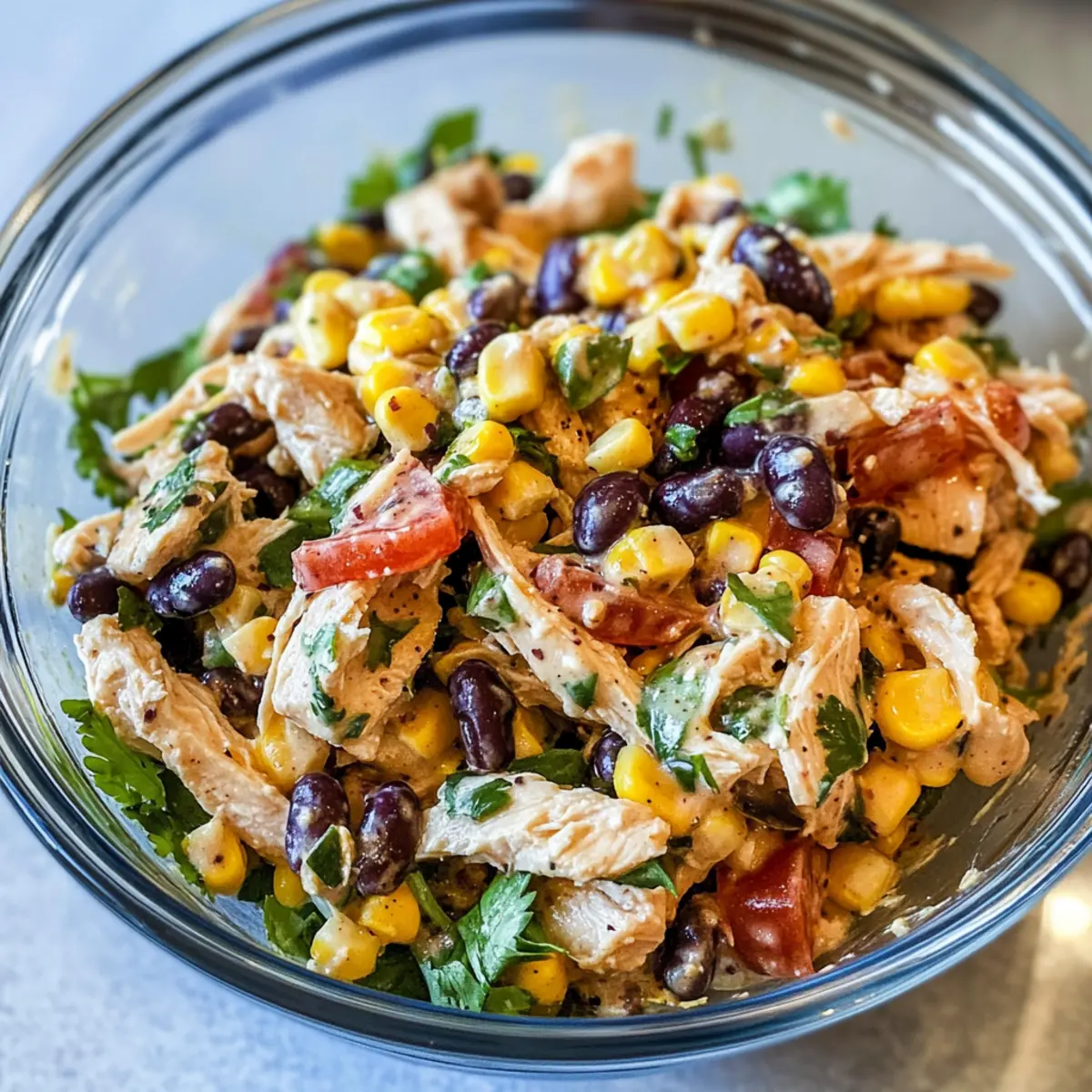 - In a large mixing bowl, combine the shredded chicken, corn kernels, black beans, diced tomatoes, chopped onions, and fresh cilantro. Toss together gently.